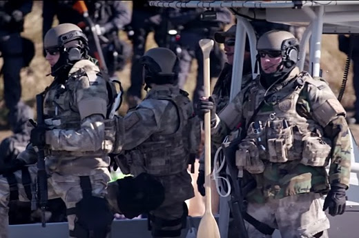 Image above: "Police" wearing full military attack gear facing Standing Rock Sioux trying to cross river to reach burial site on land Army Corps of Engineers plan for Dakota Access Pipeline. Still frame from video below.